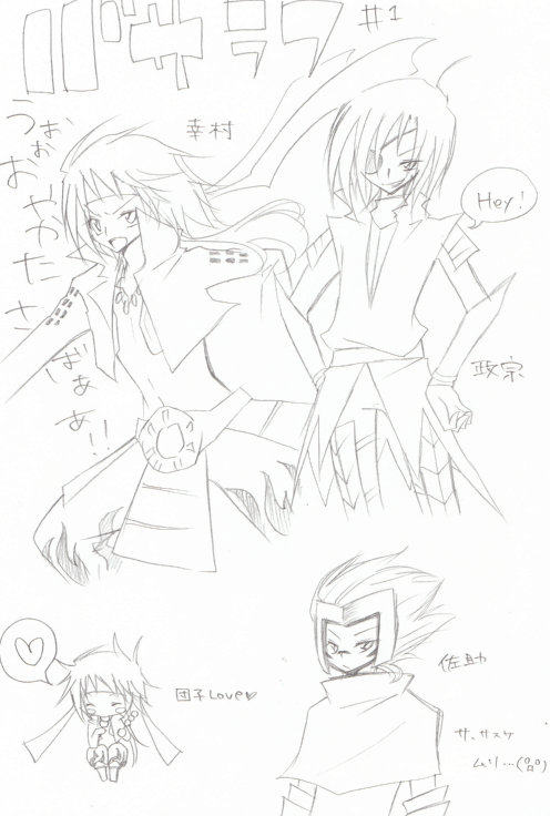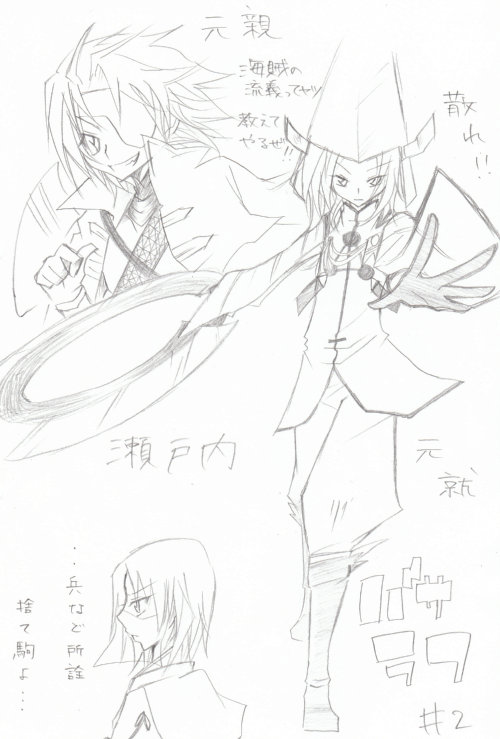 ここは「戦国BASARA」のラフ画&時々マンガのページです。 こんなんBASARAじゃねーとか苦情は受けたくないのでイメージ壊されたくない方はお戻り下さいませ。 OKな方はスクロール↓ 佐助難しい。そして幸村を初めてマトモに描いた気がする。 瀬戸内。輪刀めんどくせぇぇorz 上杉主従。やたら白いな・・・ 謙信様も描き辛い。 2009/09/06 mutsuki shigure