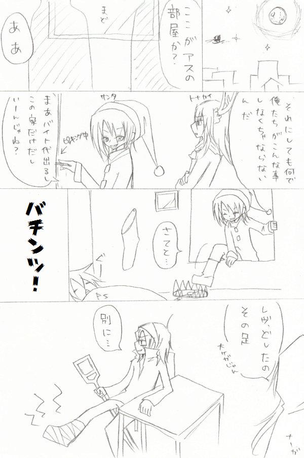 罠はアスではなく娘の部屋に忍び込もうとする不逞の輩を成敗しようとザイザンが仕掛けたもの。 バジルサンタがアス宅をレヴサンタとレクヤトナカイのペアに押し付けたのは 自分自身が捕まる(プレゼント的な)と思ったからである。 2009/12/25 mutsuki shigure