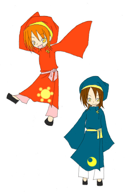 春日祢姉弟に次ぐこのサイトの双子。簡単に紹介してみようか^^ 【左】名前:今 日和(コン ニチワ) 性別:女 年齢:不詳(8〜11歳) 性格:明るく元気。楽天家。大体「何とかなる」と思っている。 とある武器職人一族の血を引く双子の姉。外見に合わず攻撃的で戦い好き。 袖にデカい刃を隠し持っていて、それで敵を真っ二つにする。 ストレート真っ向勝負が日和のスタイル。 【右】名前:今 晩和(コン バンワ) 性別:男 年齢:不詳(上に同じ) 性格:おっとりしてて冷静。暴走しがちな姉のストッパー役。キレると手に負えない。 日和の双子の弟。日和ほど攻撃的ではないが、そのかわりチクチクジワジワと精神的に敵を追い詰めるタイプ。 一直線には行かず、隙を見つけて一気に袖に隠し持つ大爪で切り裂く。 家事は一通りこなす。姉が洗濯担当で弟が料理を担当する事が多い。 「晩和!今日のご飯なにぃ?」 「麻婆豆腐だよ・・・まず手洗っておいで」 面倒なので「ウチの子〜」の説明そのまま引用(セコい) 性格は違いますが仲良しでやってます^∀^ ・・今気づいたけど、何気に増えてきてるなチャイナ系。 ブラフマーだろーセキだろーそんでこいつらだろー^^^^^^^^^^^^^^^^ 描きやすいのかしら^^ 2009/01/02 mutsuki shigure